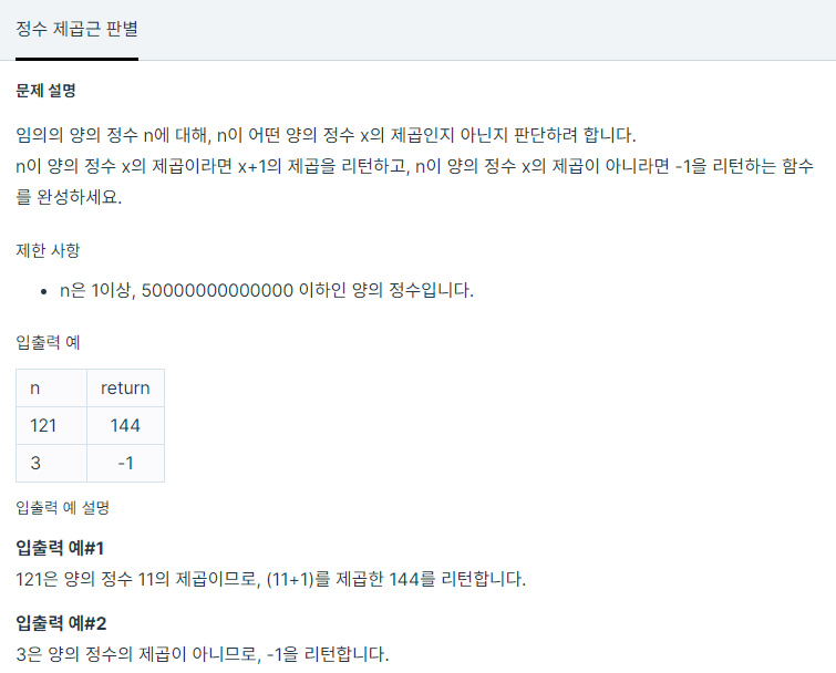 임의의 양의 정수 n에 대해, n이 어떤 양의 정수 x의 제곱인지 아닌지 판단하려 합니다. n이 양의 정수 x의 제곱이라면 x+1의 제곱을 리턴하고, n이 양의 정수 x의 제곱이 아니라면 -1을 리턴하는 함