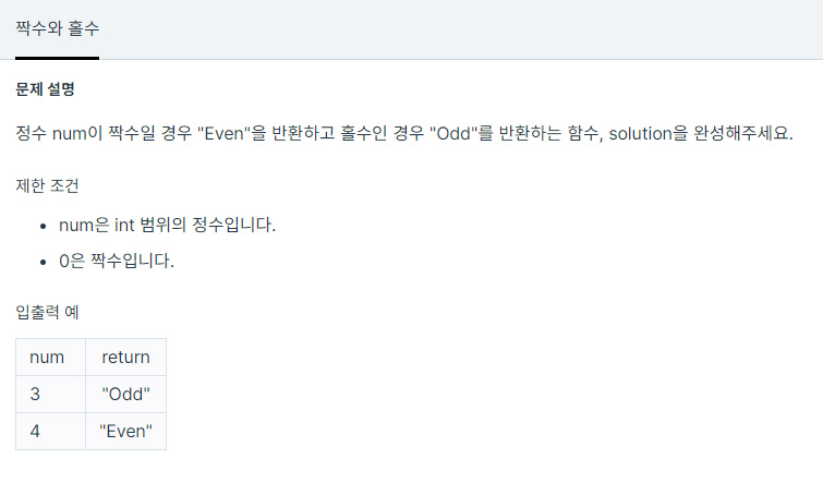 정수 num이 짝수일 경우 "Even"을 반환하고 홀수인 경우 "Odd"를 반환하는 함수, solution을 완성해주세요. 제한 조건 num은 int 범위의 정수입니다. 0은 짝수입니다. 입출력 예 num return 3 "Odd" 4 "Even"