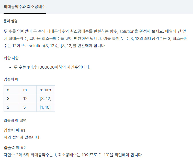 두 수를 입력받아 두 수의 최대공약수와 최소공배수를 반환하는 함수, solution을 완성해 보세요. 배열의 맨 앞에 최대공약수, 그다음 최소공배수를 넣어 반환하면 됩니다. 예를 들어 두 수 3, 12의