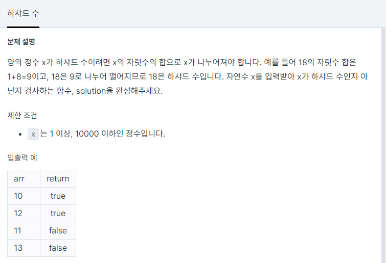 양의 정수 x가 하샤드 수이려면 x의 자릿수의 합으로 x가 나누어져야 합니다. 예를 들어 18의 자릿수 합은 1+8=9이고, 18은 9로 나누어 떨어지므로 18은 하샤드 수입니다. 자연수 x를 입력받아 x가 하