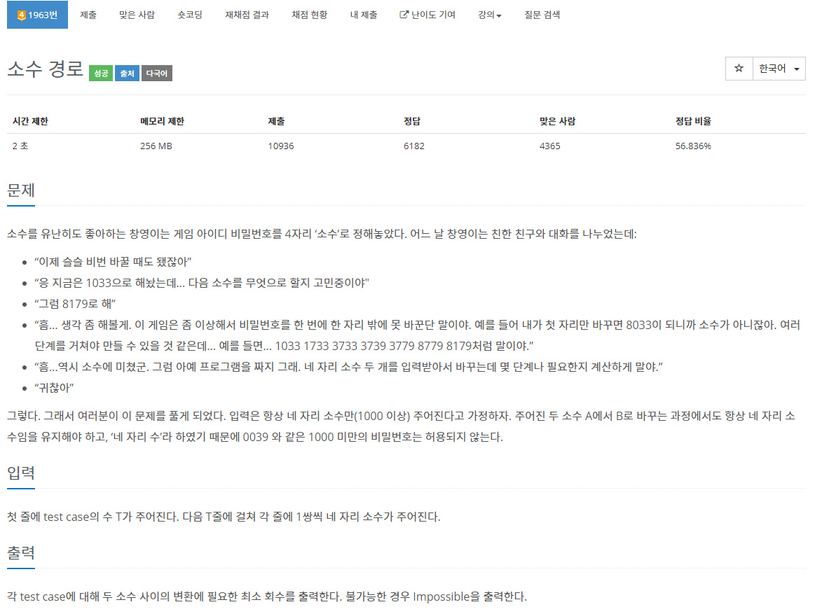 소수를 유난히도 좋아하는 창영이는 게임 아이디 비밀번호를 4자리 ‘소수’로 정해놓았다. 어느 날 창영이는 친한 친구와 대화를 나누었는데: “이제 슬슬 비번 바꿀 때도 됐잖아” “응 지금