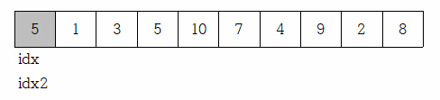 이런 식으로 sum값이 목푯값보다 작다면 sum+=arr[idx2]을 하고 idx2를 한 칸 오른쪽으로,