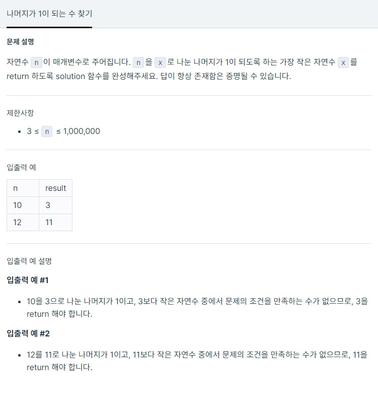 자연수 n이 매개변수로 주어집니다. n을 x로 나눈 나머지가 1이 되도록 하는 가장 작은 자연수 x를 return 하도록 solution 함수를 완성해주세요. 답이 항상 존재함은 증명될 수 있습니다. 제한사항 입