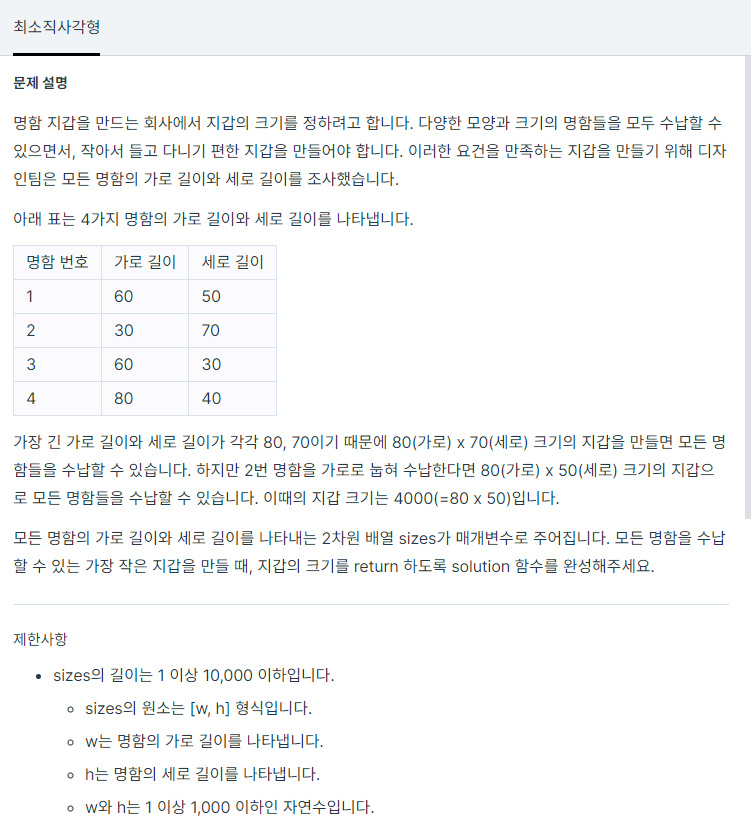 C++ / 프로그래머스 / 위클리 챌린지 8주차 / 최소직사각형 본문