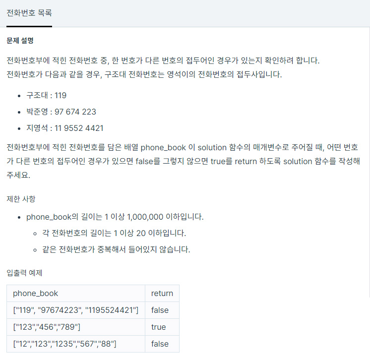 한 번호가 다른 번호의 맨 앞에 있는 경우가 있는지를 확인하는 문제이다.