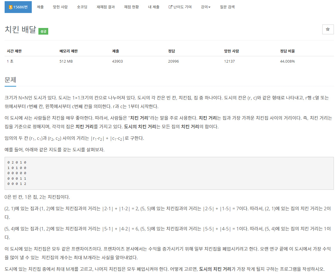 크기가 N×N인 도시가 있다. 도시는 1×1크기의 칸으로 나누어져 있다. 도시의 각 칸은 빈 칸, 치킨집, 집 중 하나이다. 도시의 칸은 (r, c)와 같은 형태로 나타내고, r행 c열 또는 위에서부터 r번째 칸