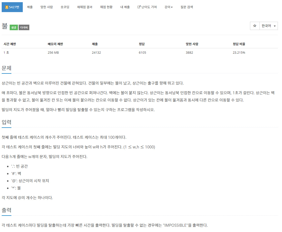 상근이는 빈 공간과 벽으로 이루어진 건물에 갇혀있다. 건물의 일부에는 불이 났고, 상근이는 출구를 향해 뛰고 있다. 매 초마다, 불은 동서남북 방향으로 인접한 빈 공간으로 퍼져나간다. 벽에