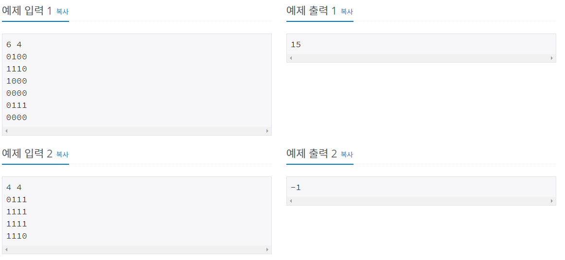 N×M의 행렬로 표현되는 맵이 있다. 맵에서 0은 이동할 수 있는 곳을 나타내고, 1은 이동할 수 없는 벽이 있는 곳을 나타낸다. 당신은 (1, 1)에서 (N, M)의 위치까지 이동하려 하는데, 이때 최단 경로