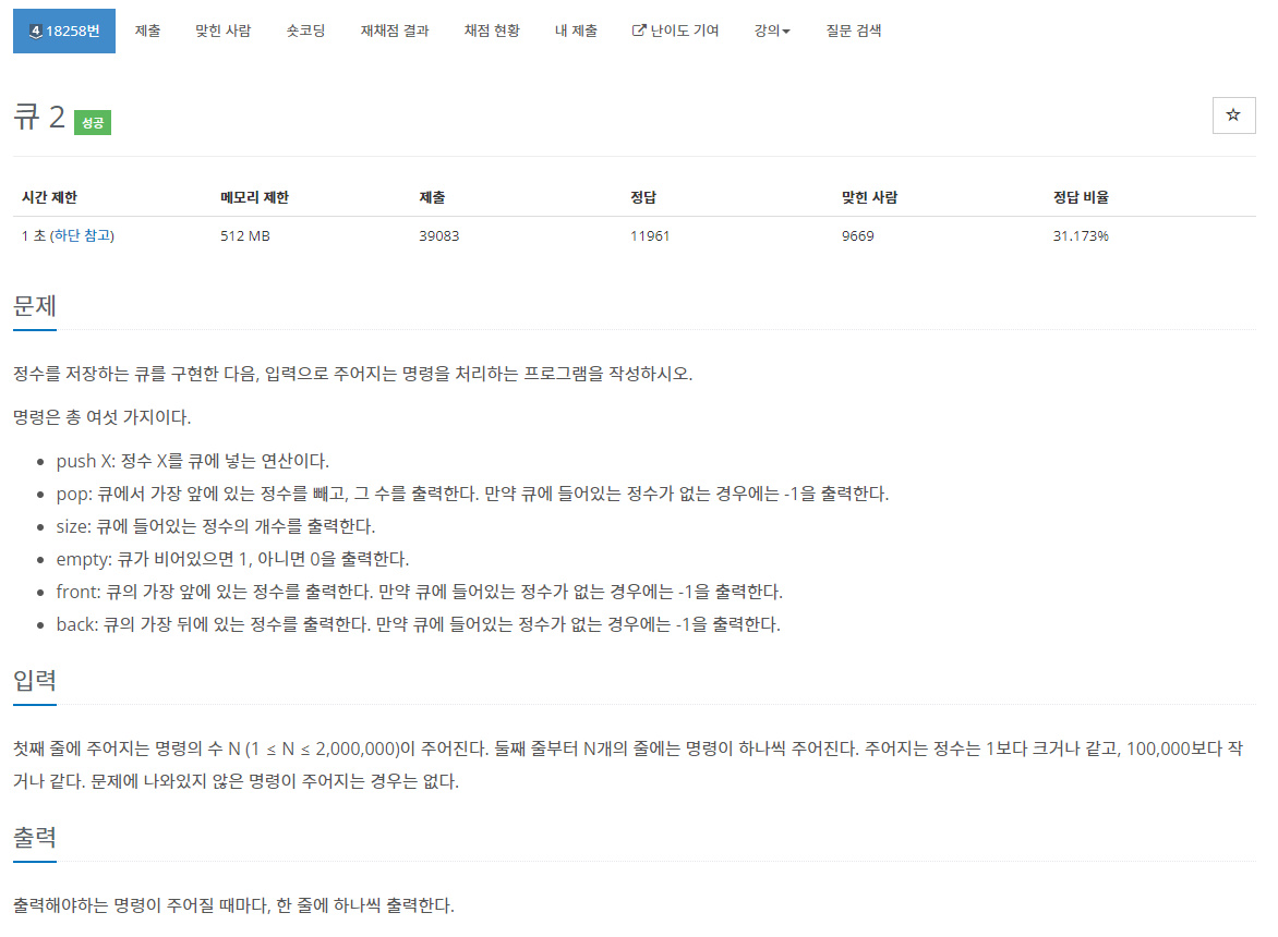 - pop은 큐가 비어있지 않을 때 q.front() 값을 출력하고 pop을 하였고