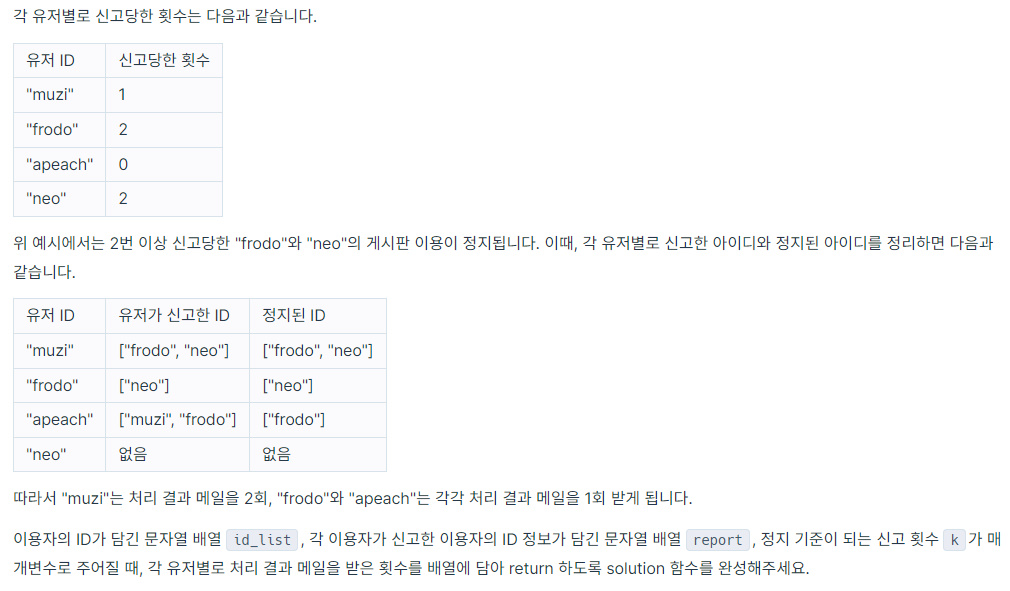 문제 설명 신입사원 무지는 게시판 불량 이용자를 신고하고 처리 결과를 메일로 발송하는 시스템을 개발하려 합니다. 무지가 개발하려는 시스템은 다음과 같습니다. 각 유저는 한 번에 한 명의