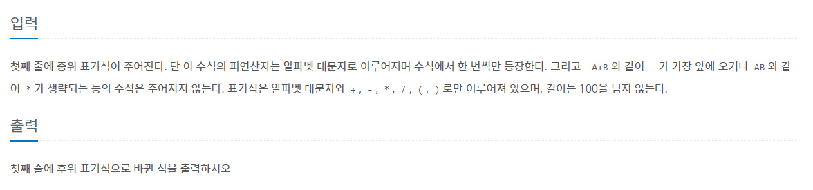 첫째 줄에 중위 표기식이 주어진다. 단 이 수식의 피연산자는 알파벳 대문자로 이루어지며 수식에서 한 번씩만 등장한다. 그리고 -A+B와 같이 -가 가장 앞에 오거나 AB와 같이 *가 생략되는 등의