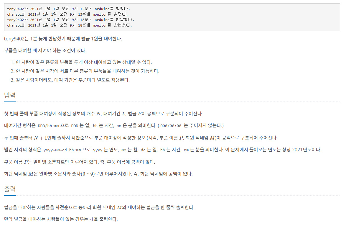 첫 번째 줄에 부품 대여장에 작성된 정보의 개수 $N$, 대여기간 $L$, 벌금 $F$이 공백으로 구분되어 주어진다. 대여기간 형식은 DDD/hh:mm으로 DDD는 일, hh는 시간, mm은 분을 의미한다. (000/00:00 는 주어