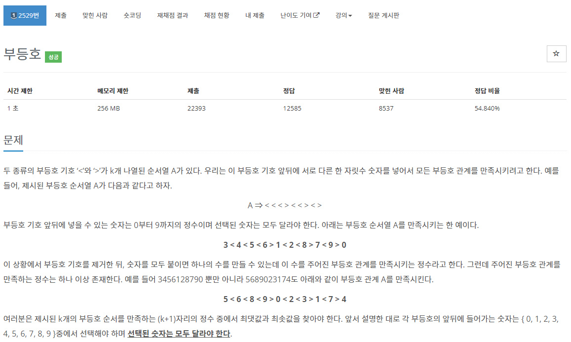 0부터 9까지의 수를 이용하여 해당 부등호에 맞게 배치하면 된다.