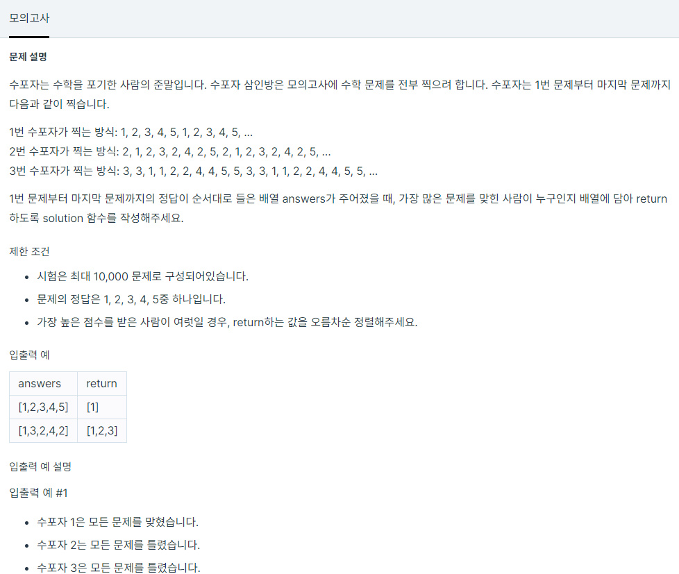 따라서 수포자 1은 i%5를 하여 arr1[0], arr[1], ... , arr[4]가 반복하고 다른 수포자도 원소수만큼 반복하게 한다.