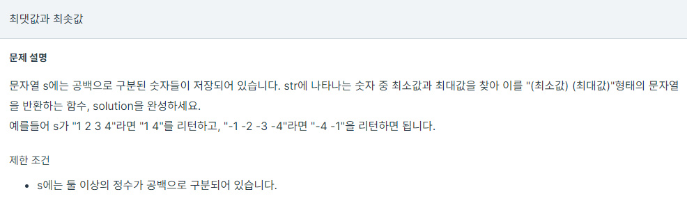 마지막으로 answer에 최솟값 + " " + 최댓값을 저장하고 return 한다.