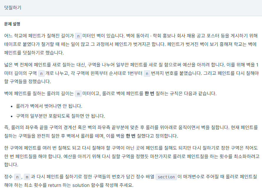section을 탐색하면서 roller값이 더 작다면 롤러를 옮겨야 하므로 roller값을 section + m - 1로 바꾸고 answer에 1을 더한다.