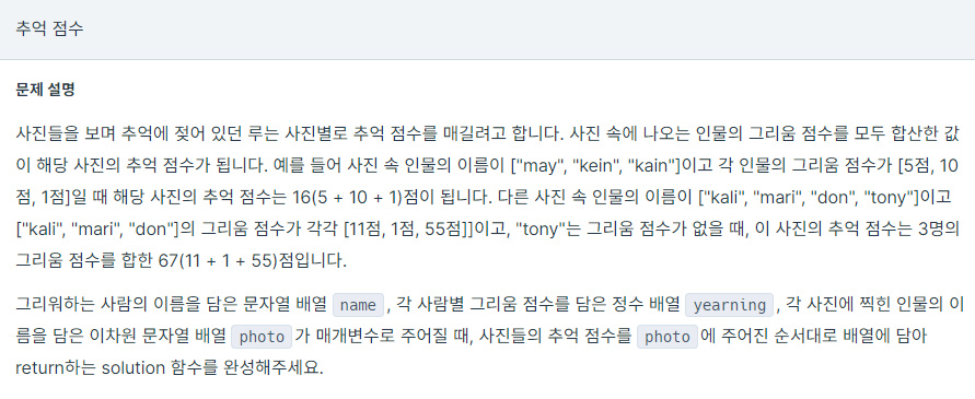 photo를 탐색하면서 map[이름]의 점수가 있다면 더해서 answer에 합산하여 저장한다.