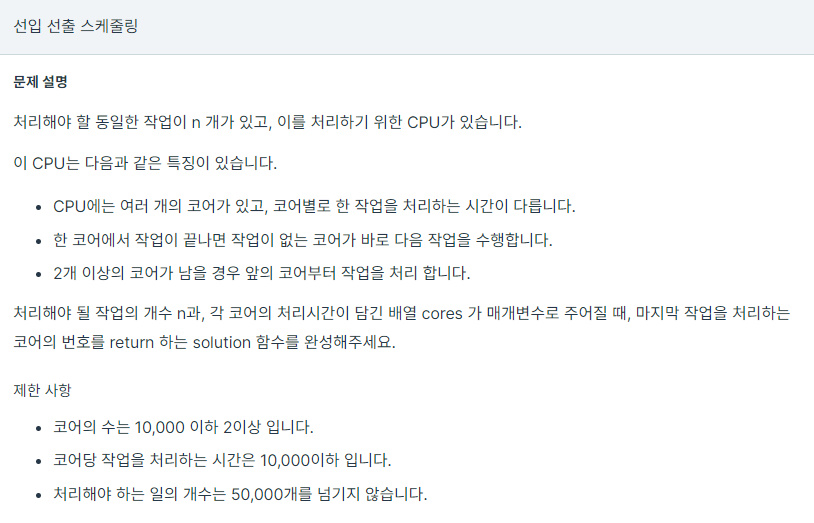 두 번째 문제로는 마지막 작업을 처리하는 코어의 번호를 return하라길래 마지막에 혼자 남아 작업하는 코어의 번호를 return 하는 줄 알았는데 아니었다.