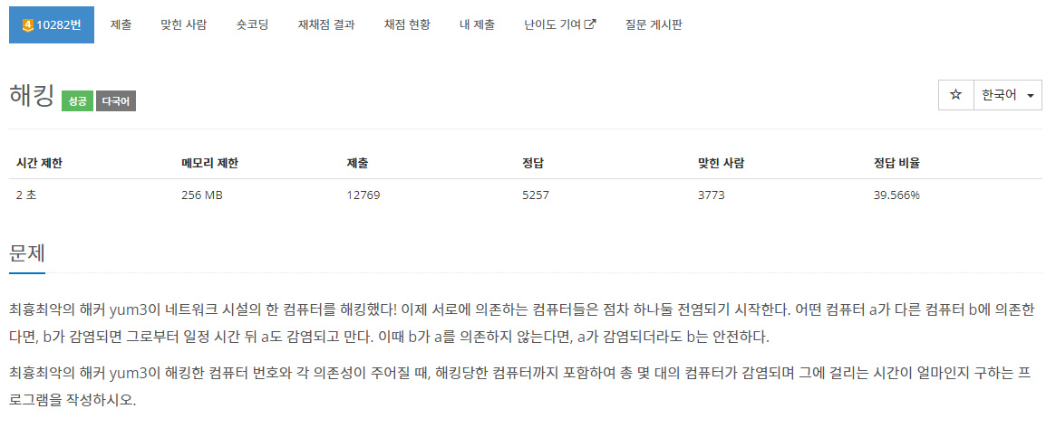 최흉최악의 해커 yum3이 네트워크 시설의 한 컴퓨터를 해킹했다! 이제 서로에 의존하는 컴퓨터들은 점차 하나둘 전염되기 시작한다. 어떤 컴퓨터 a가 다른 컴퓨터 b에 의존한다면, b가 감염되면