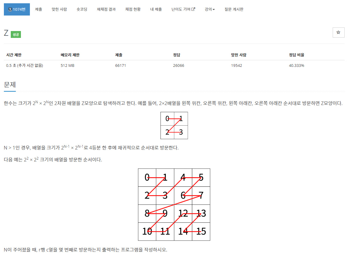 한수는 크기가 2N × 2N인 2차원 배열을 Z모양으로 탐색하려고 한다. 예를 들어, 2×2배열을 왼쪽 위칸, 오른쪽 위칸, 왼쪽 아래칸, 오른쪽 아래칸 순서대로 방문하면 Z모양이다. N > 1인 경우, 배열을