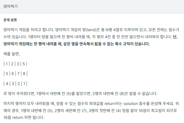 그리고 입출력 예를 보면 다음 행의 칸에서 같은 열만 아니면 다 밟을 수 있으므로 DP를 이용하면 쉽게 풀 수 있다.