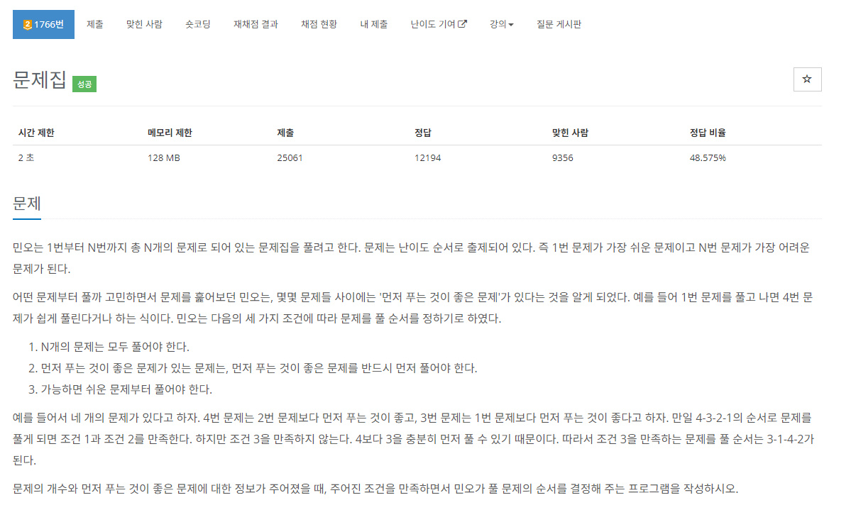현재 풀 수 있는 문제가 여러 개라면 번호가 낮은 문제 먼저 풀어야 한다.