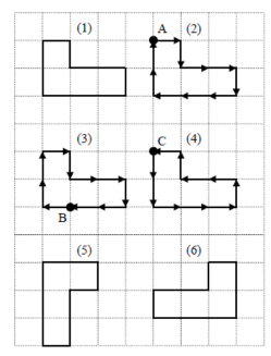 모눈종이에 다각형을 그리려고 한다. 그리는 방법은 모양수열로 표시된다. 모양수열은 1과 4사이의 숫자가 연속되어 나열된 것으로 1은 오른쪽으로, 2는 위쪽으로, 3은 왼쪽으로, 4는 아래쪽으로