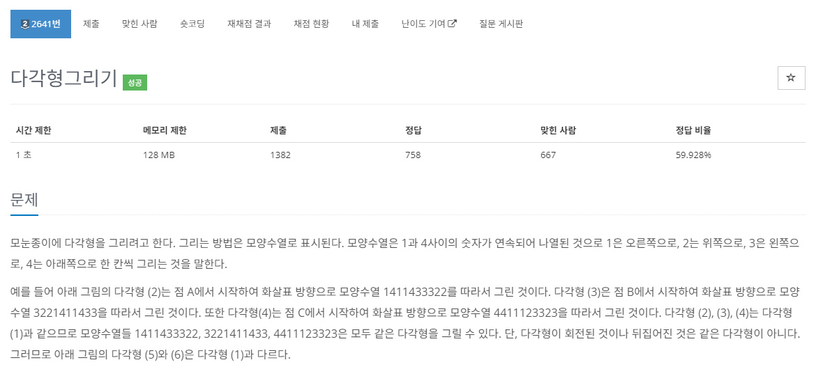 모눈종이에 다각형을 그리려고 한다. 그리는 방법은 모양수열로 표시된다. 모양수열은 1과 4사이의 숫자가 연속되어 나열된 것으로 1은 오른쪽으로, 2는 위쪽으로, 3은 왼쪽으로, 4는 아래쪽으로