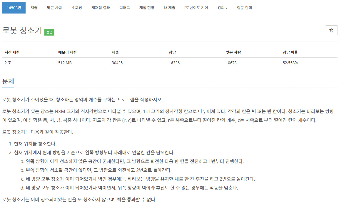 로봇 청소기가 주어졌을 때, 청소하는 영역의 개수를 구하는 프로그램을 작성하시오. 로봇 청소기가 있는 장소는 N×M 크기의 직사각형으로 나타낼 수 있으며, 1×1크기의 정사각형 칸으로 나누어