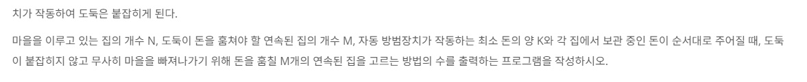 붙어있는 m개 만큼의 집을 고르고 돈의 총합을 구해 K보다 작으면 개수를 하나 늘려주면 된다.