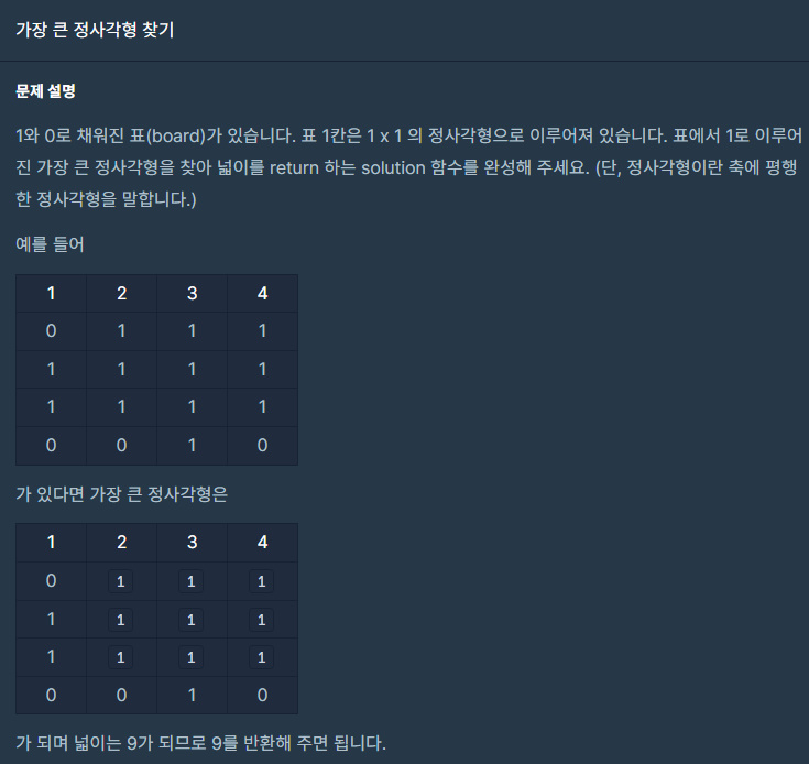 C++ / 프로그래머스 / 가장 큰 정사각형 찾기 본문