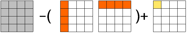 파란 부분을 제외한 맨 아래칸까지, 맨 오른 칸까지의 누적합을 빼고, 두 번 뺀 구간인 주황색이 겹치는 구간의 누적합을 더하면 된다.