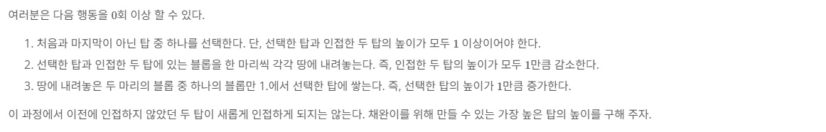 블롭들은 심심해서 서로를 이용해 $N$개의 탑을 만들었다. 각 탑의 높이는 그 탑에 있는 블롭의 수와 같다. 여러분은 다음 행동을 $0$회 이상 할 수 있다. 처음과 마지막이 아닌 탑 중 하나를 선