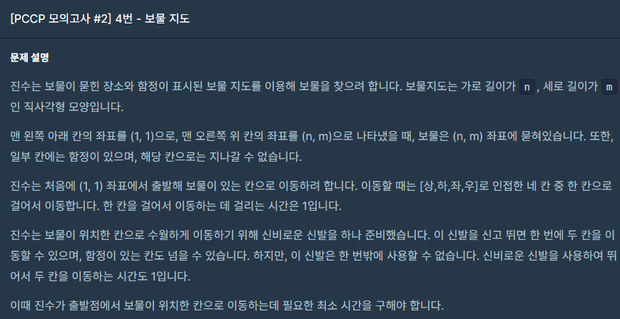 맨 왼쪽 아래칸(시작칸)이 (1, 1) 좌표이며 (x=n, y=m)인 도착지점을 가는데 필요한 최소 시간을 구하는 문제이다.