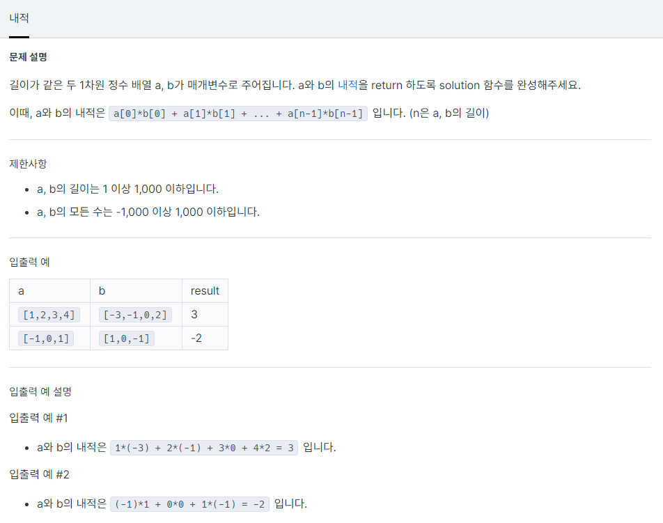 길이가 같은 두 1차원 정수 배열 a, b가 매개변수로 주어집니다. a와 b의 내적을 return 하도록 solution 함수를 완성해주세요. 이때, a와 b의 내적은 a[0]*b[0] + a[1]*b[1] + ... + a[n-1]*b[n-1] 입니다. (n은 a, b의