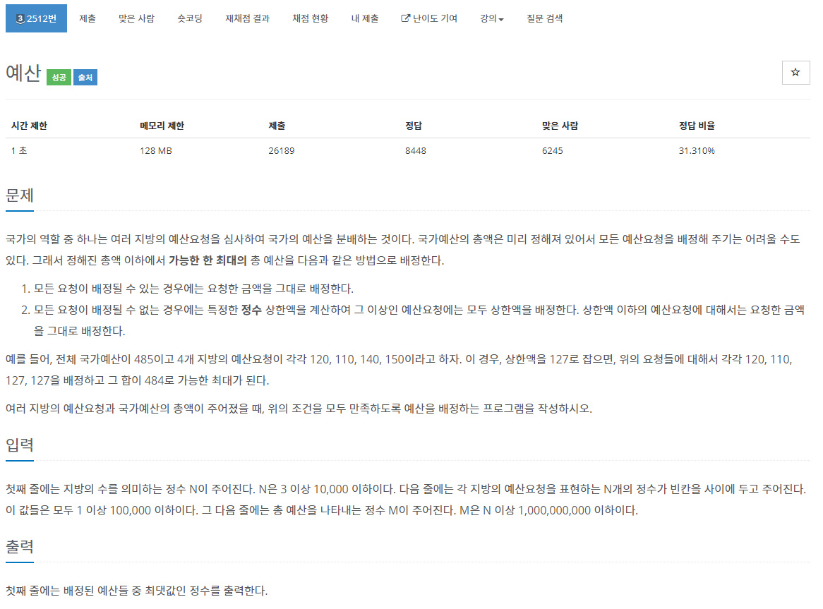 첫째 줄에는 지방의 수를 의미하는 정수 N이 주어진다. N은 3 이상 10,000 이하이다. 다음 줄에는 각 지방의 예산요청을 표현하는 N개의 정수가 빈칸을 사이에 두고 주어진다. 이 값들은 모두 1 이상
