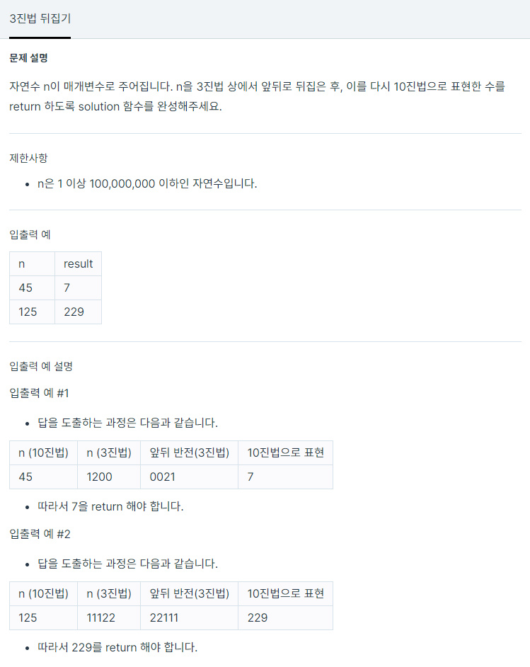 자연수 n이 매개변수로 주어집니다. n을 3진법 상에서 앞뒤로 뒤집은 후, 이를 다시 10진법으로 표현한 수를 return 하도록 solution 함수를 완성해주세요. 제한사항 n은 1 이상 100,000,000 이하인 자연수