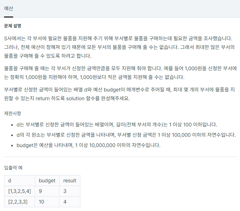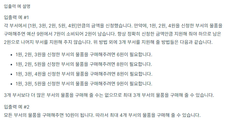S사에서는 각 부서에 필요한 물품을 지원해 주기 위해 부서별로 물품을 구매하는데 필요한 금액을 조사했습니다. 그러나, 전체 예산이 정해져 있기 때문에 모든 부서의 물품을 구매해 줄 수는