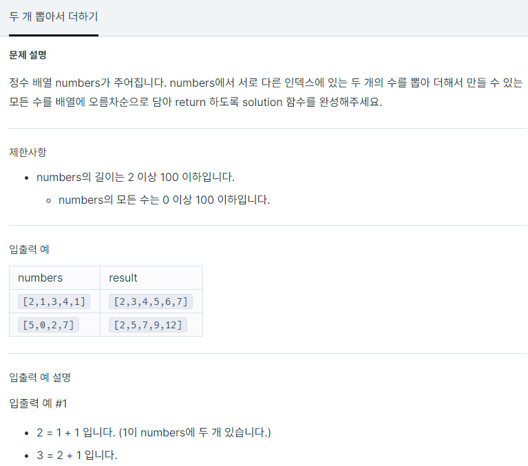 정수 배열 numbers가 주어집니다. numbers에서 서로 다른 인덱스에 있는 두 개의 수를 뽑아 더해서 만들 수 있는 모든 수를 배열에 오름차순으로 담아 return 하도록 solution 함수를 완성해주세요. 제한