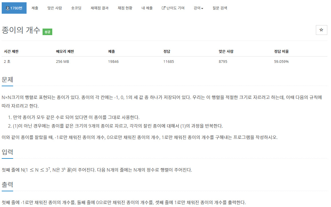 N×N크기의 행렬로 표현되는 종이가 있다. 종이의 각 칸에는 -1, 0, 1의 세 값 중 하나가 저장되어 있다. 우리는 이 행렬을 적절한 크기로 자르려고 하는데, 이때 다음의 규칙에 따라 자르려고 한다.