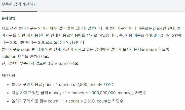 C++ / 프로그래머스 / 위클리 챌린지 1주차 / 부족한 금액 계산하기 본문