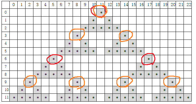 [y][x] = *, [y+1][x-1], [y+1][x+1] = *, [y+1][x-2] ~ [y+1][x+2] = *이라는 기본 형태를 잡아준다.