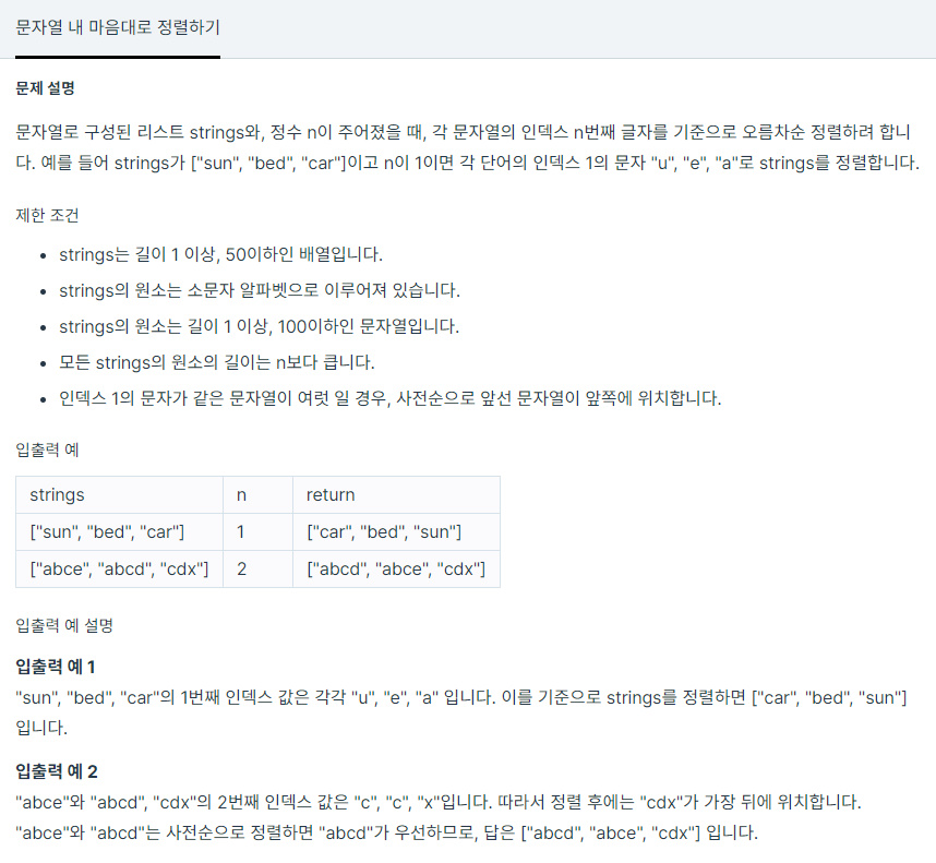 문자열로 구성된 리스트 strings와, 정수 n이 주어졌을 때, 각 문자열의 인덱스 n번째 글자를 기준으로 오름차순 정렬하려 합니다. 예를 들어 strings가 ["sun", "bed", "car"]이고 n이 1이면 각 단어의 인덱