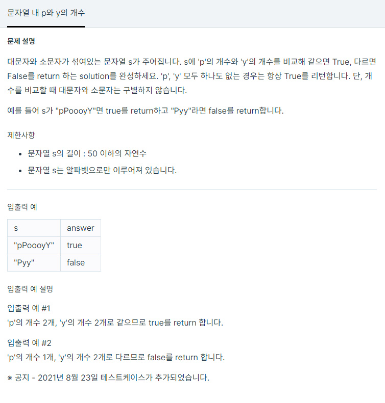 대문자와 소문자가 섞여있는 문자열 s가 주어집니다. s에 'p'의 개수와 'y'의 개수를 비교해 같으면 True, 다르면 False를 return 하는 solution를 완성하세요. 'p', 'y' 모두 하나도 없는 경우는 항상 True를