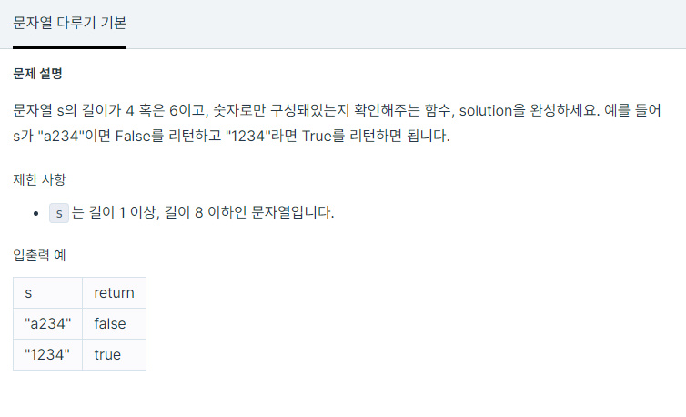 문자열 s의 길이가 4 혹은 6이고, 숫자로만 구성돼있는지 확인해주는 함수, solution을 완성하세요. 예를 들어 s가 "a234"이면 False를 리턴하고 "1234"라면 True를 리턴하면 됩니다. 제한 사항 s는 길이 1