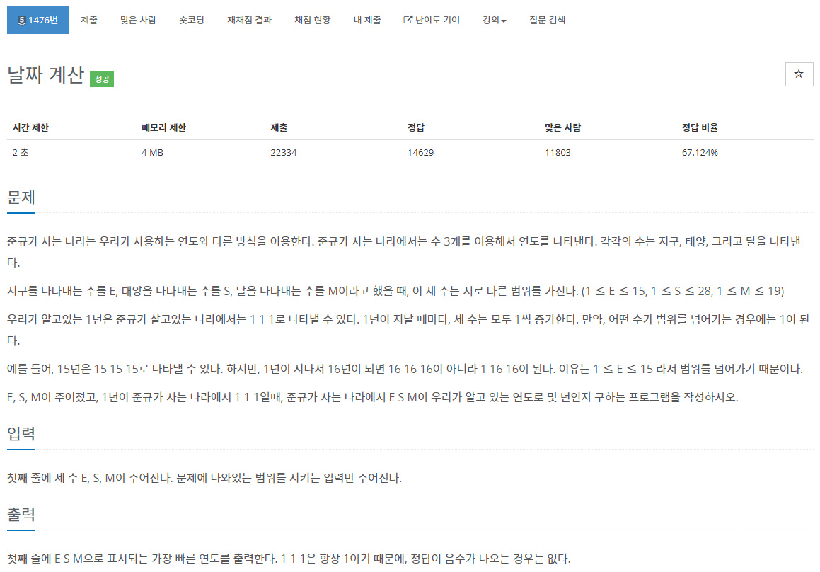준규가 사는 나라는 우리가 사용하는 연도와 다른 방식을 이용한다. 준규가 사는 나라에서는 수 3개를 이용해서 연도를 나타낸다. 각각의 수는 지구, 태양, 그리고 달을 나타낸다. 지구를 나타