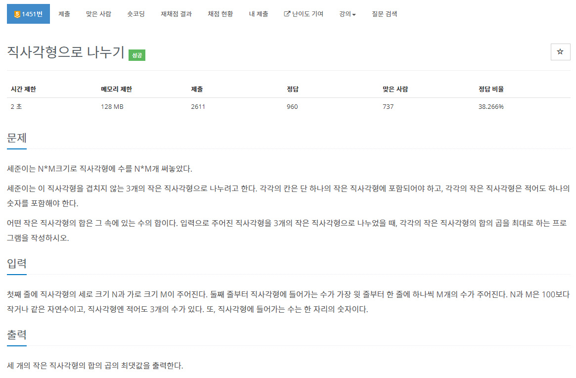 그다음 Div1, Div2, Div3에서 구한 각각의 직사각형들의 누적합들을 곱하고 그중 최댓값을 출력한다.