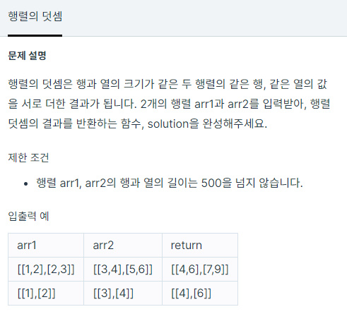 행렬의 덧셈은 행과 열의 크기가 같은 두 행렬의 같은 행, 같은 열의 값을 서로 더한 결과가 됩니다. 2개의 행렬 arr1과 arr2를 입력받아, 행렬 덧셈의 결과를 반환하는 함수, solution을 완성해주세요