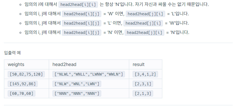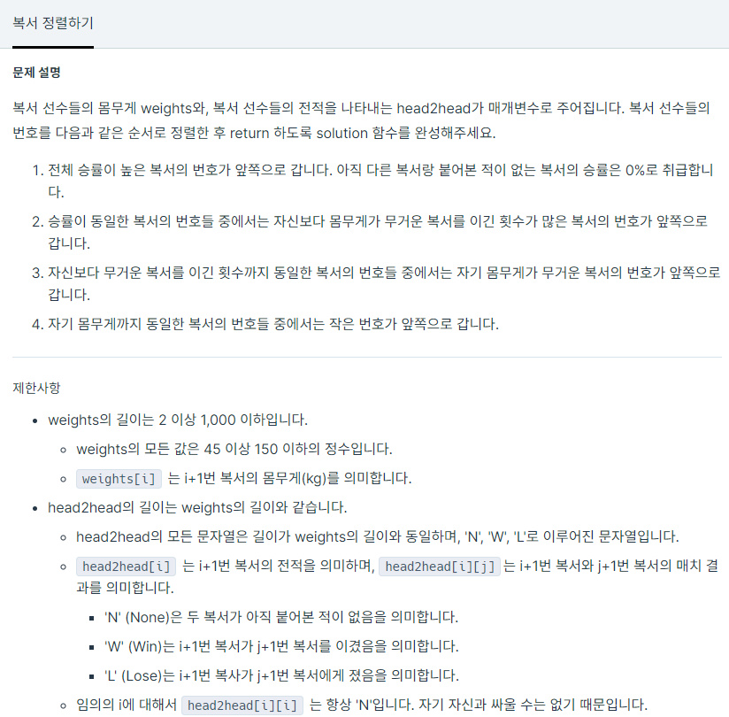 복서 선수들의 몸무게 weights와, 복서 선수들의 전적을 나타내는 head2head가 매개변수로 주어집니다. 복서 선수들의 번호를 다음과 같은 순서로 정렬한 후 return 하도록 solution 함수를 완성해주세요