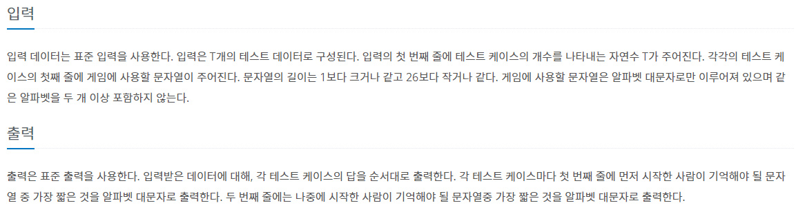 출력은 표준 출력을 사용한다. 입력받은 데이터에 대해, 각 테스트 케이스의 답을 순서대로 출력한다. 각 테스트 케이스마다 첫 번째 줄에 먼저 시작한 사람이 기억해야 될 문자열 중 가장 짧은